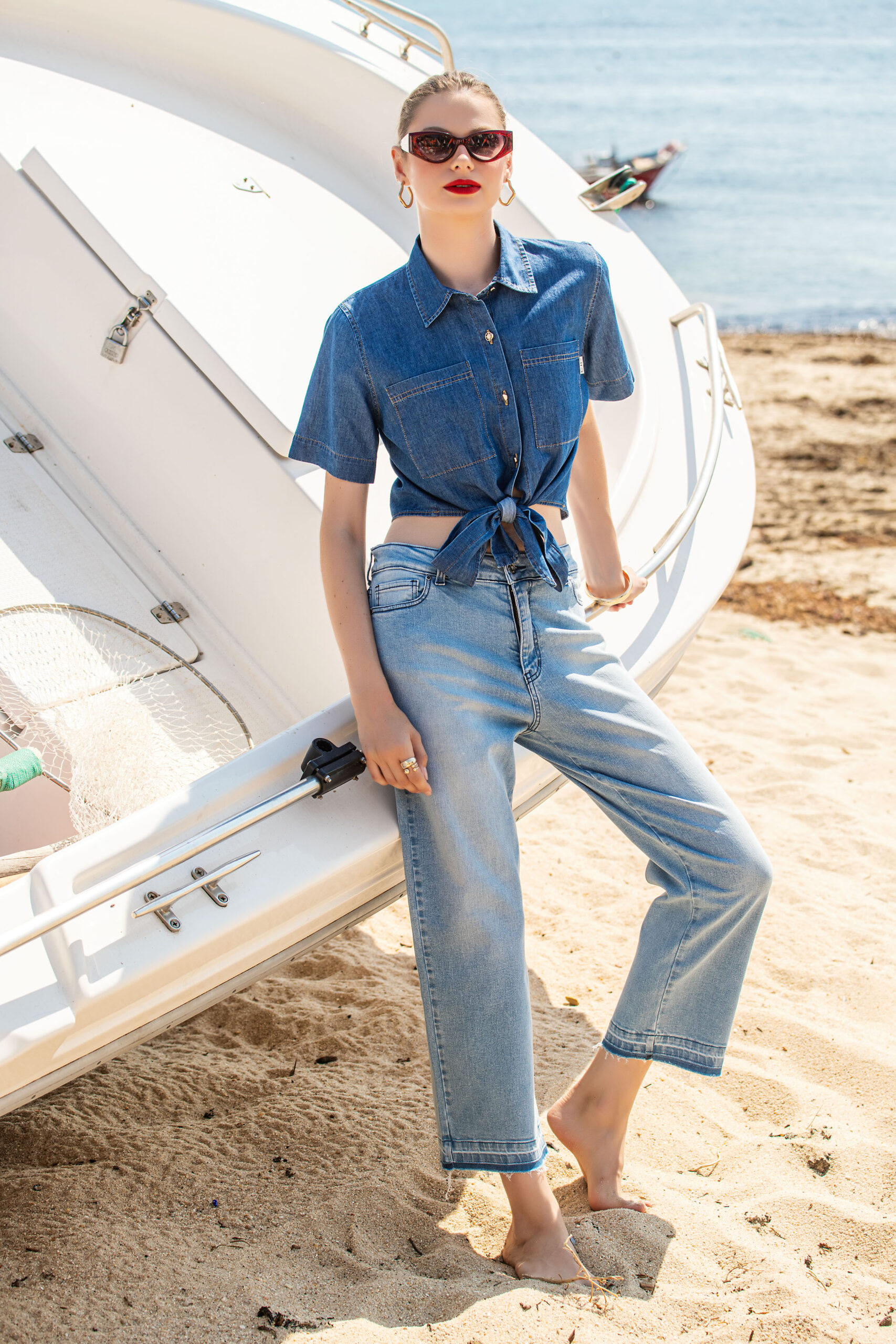 Calça de ganga, de 5 bolsos, com perna larga que garante um cair elegante e atual. Confecionada em algodão com uma pequena percentagem de elastano, proporciona maior conforto e liberdade de movimentos. Aperta por botão e fecho de correr, é enriquecido por um acabamento diferenciado na bainha, que acrescenta personalização e sofisticação à peça.