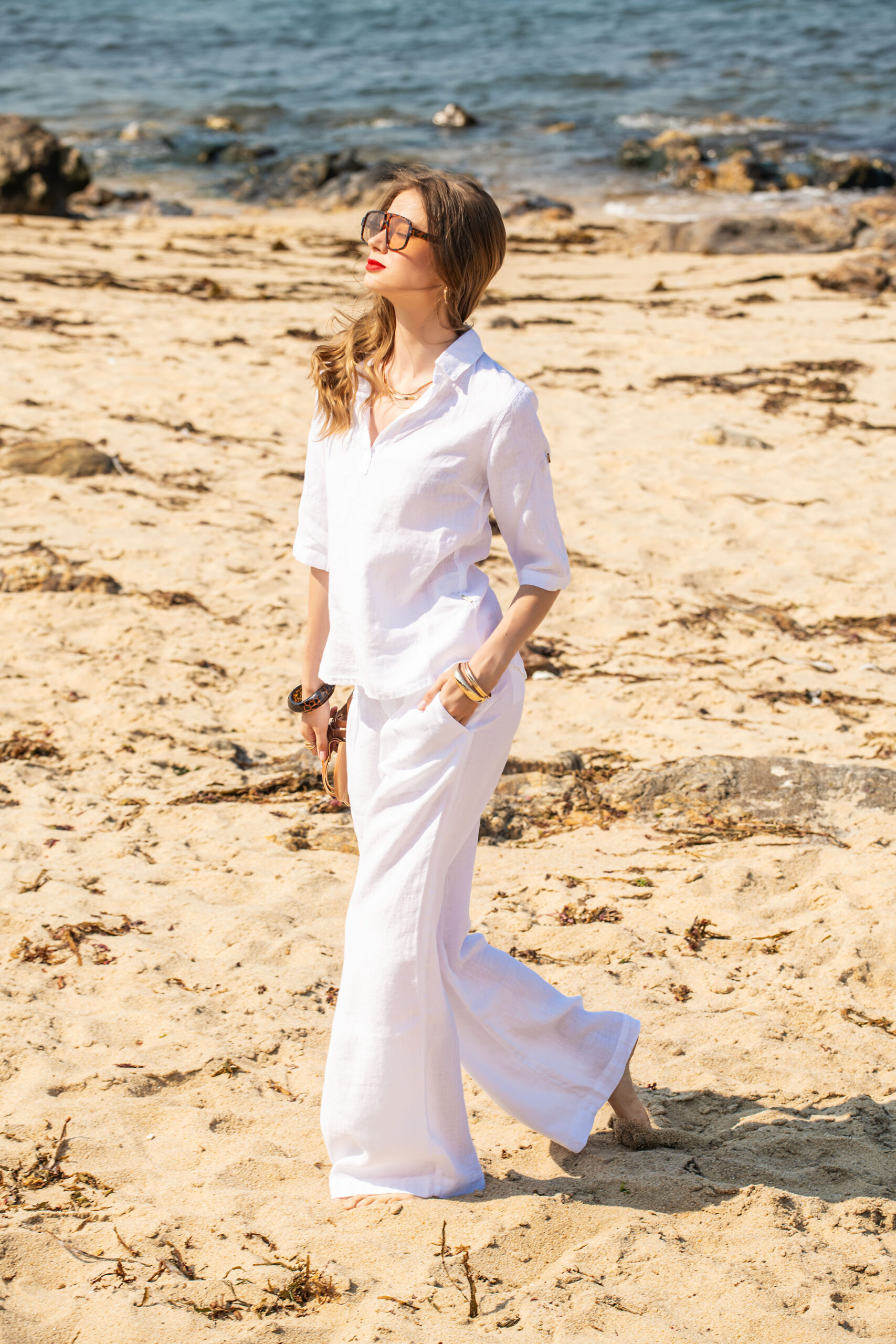 Calça em linho leve e respirável, com perna larga e pregas à frente que conferem elegância e fluidez ao movimento. Os dois bolsos laterais acrescentam funcionalidade ao design, enquanto apertam com botão e fecho que garante um ajuste seguro e confortável. Uma peça pensada para um cair sofisticado e natural, ideal para looks de verão com leveza e distinção.