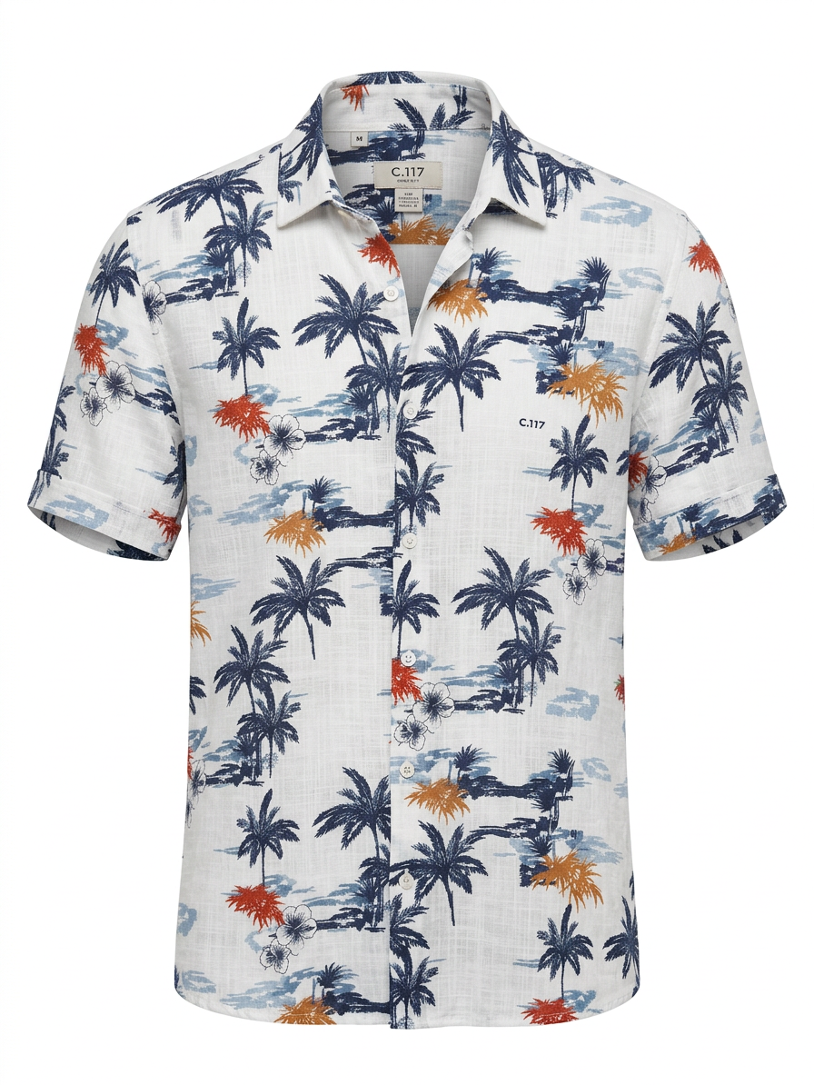 Camisa de manga curta, com estampado tropical, confecionada em 100% algodão, leve e fresca, ideal para os dias mais quentes. Garante um vestimento confortável e descontraído, perfeito para looks de verão com um toque elegante e casual.