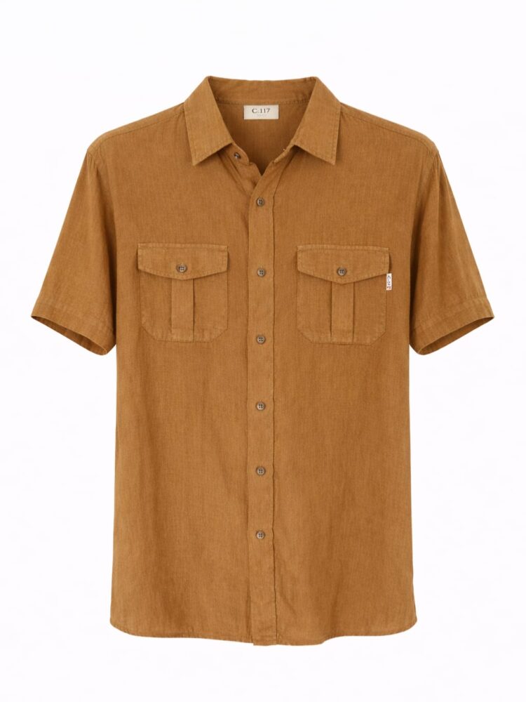 Camisa masculina de linho. Elegante, com um corte descontraído, bolsos frontais com pala, combina elegância, conforto, e sofisticação natural. Perfeita para um estilo moderno e cuidado, do dia a dia aos momentos mais descontraídos de verão.