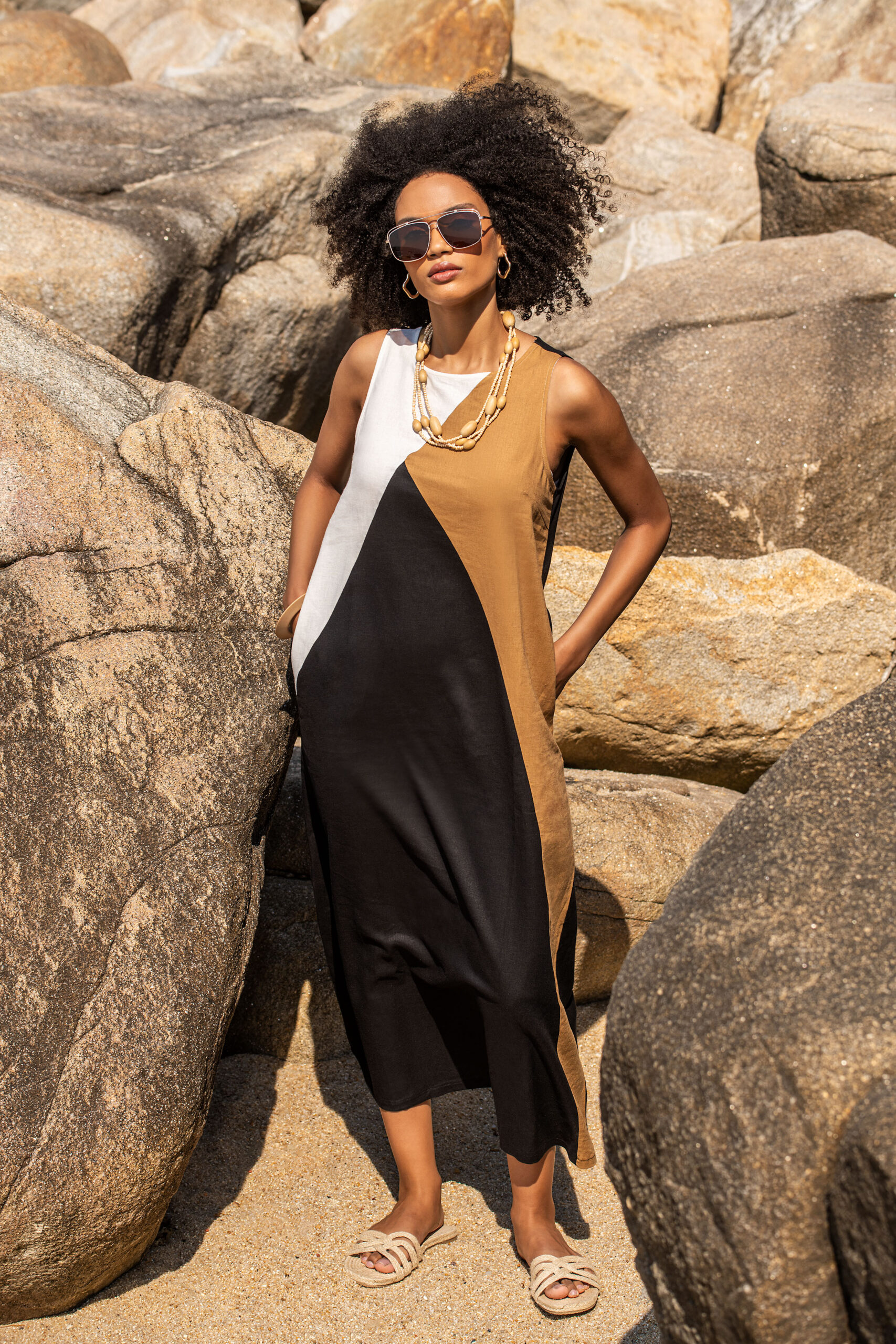 Vestido pensado para se destacar com elegância. O jogo de cores cria um impacto visual moderno, enquanto o corte fluido garante leveza e conforto ao longo do dia. Com detalhes práticos integrados no design, é uma peça, versátil e cheia de personalidade.